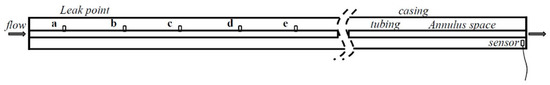 As shown in Figure 8, five leak positions were set on the tubing string and were labeled a, b, c, d, and e. The distances between the acoustic sensor and the five positions were 45.75, 42.18, 39.18, 35.84, and 32.84 m, respectively. Only one hole leaked in each experiment. When the gas flowed through the tubing, some nitrogen would leak into the annulus, and acoustic waves would be generated and measured.