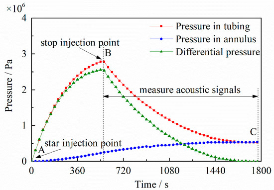 During experiments, the gas supply was stopped when the differential pressure reached a certain level, as shown in Figure 9. The acoustic signals were measured when the differential pressure in the BC segment reached the preset values. The sampling frequency of the acoustic signals was 30,000 Hz, and the sampling frequency of the pressure and temperature signals was 10 Hz. The measurements were repeated several times to ensure reproducibility.