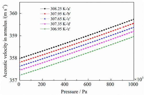 First, the acoustic velocity in the annulus was calculated based on Equation (3). As shown in Figure 11, the acoustic velocities in the experimental annulus are approximately 357 m s−1 to 359 m s−1.