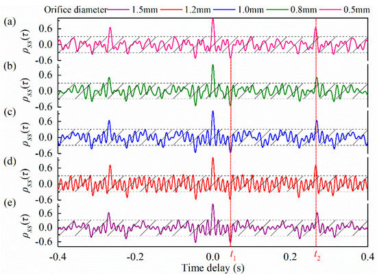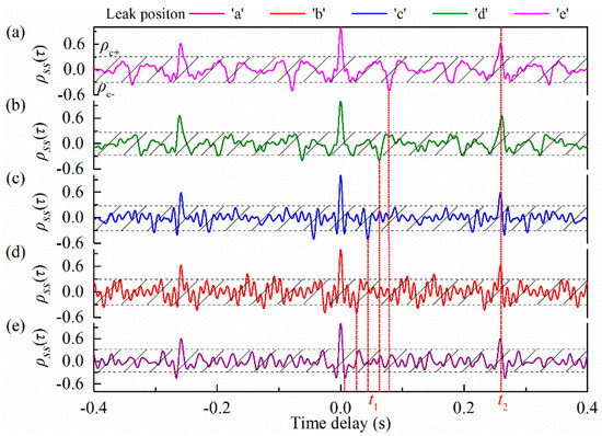 Then, the characteristic time was extracted, as shown in Figure 12a–e. After repeated verification, the optimal time window in the autocorrelation analysis was set as 0.4 s. A threshold for autocorrelation coefficients was set when extracting t1 and t2. The threshold was ±0.3. The characteristic time t1 varies with the leak positions, while t2 has the same value. This is due to the fact that t1 characterizes the distance between the leak point and liquid level, while t2 characterizes the length of the annulus (i.e., liquid level).