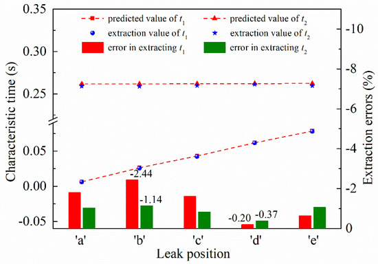 Although the errors of each factor are difficult to quantify, the total errors are known. As mentioned above, the errors of t1 and t2 can be quantified. The errors of t2 are equal to the errors in calculating the annulus length. This shows that the errors of t1 and t2 are actually the combination of errors in calculating acoustic velocity and extracting characteristic time, and the errors in the process of locating leakages are smaller than the errors of t1. The total error is reduced during the localization process. Consequently, the process of extracting characteristic time and calculating acoustic velocity are the main error sources for this method.