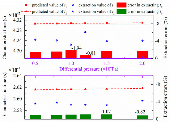 Predicted values, extraction values, and extraction errors of t1 and t2 for different differential pressures.