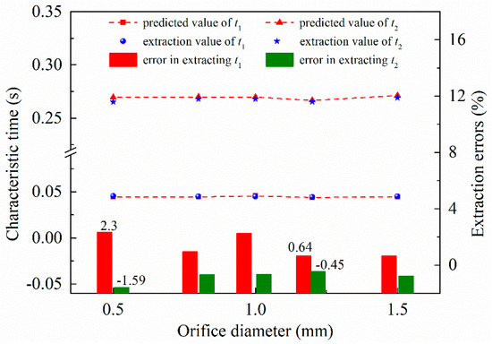 Predicted values, extraction values, and extraction errors of t1 and t2 for different orifice diameters.