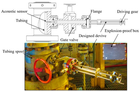 A test system was designed as shown in Figure 18. The type and installation of the acoustic sensor was the same as the laboratory experiments. As shown in Figure 18a, the flange was first connected to the gate valve, and the gate valve was opened slowly. Then the sensor was pushed into the annulus along the flow passage by rotating the driving gear. To adapt the field conditions, the signal conditioner, data acquisition unit, and power supply were integrated in an explosion-proof box.