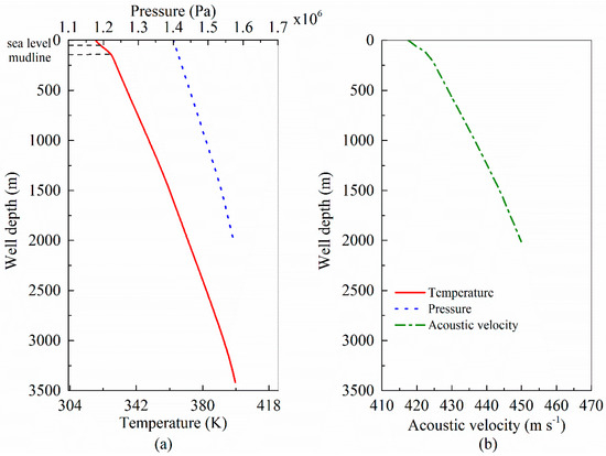 As shown in Figure 3b, the wellbore is first divided into N segments from the wellhead to the bottom-hole. The parameters of every segment can be obtained by successive iterations using Equations (9) and (12). After obtaining the annular temperature and pressure, the acoustic velocity in the annulus can be calculated.