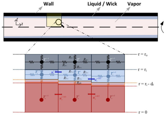 Each node in Figure 1 is a lump mass characterized by a unique thermodynamic state. The resistances are associated with thermal conduction through the material and the phase change. As can be seen in the figure, the mesh is staggered such that the temperatures and pressures are located at cell centers, whereas velocities are located at cell faces. The liquid and the vapor mesh can grow and shrink in the radial direction. In this way, the location of the interface for an axial location can change in time and liquid head can be incorporated in the model. The architecture of the nodes and their connections allow the same equations to be used throughout the whole heat pipe.