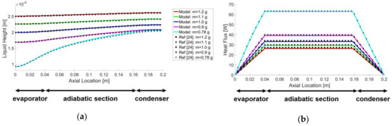 The results of the liquid height distribution and the heat flow along the heat pipe are compared in Figure 3. As stated in Section 2.5, a finer mesh in the axial direction is required for very low fill ratios. Therefore, the axial mesh number is 108 for the lowest fill ratio case and 36 for all other cases.