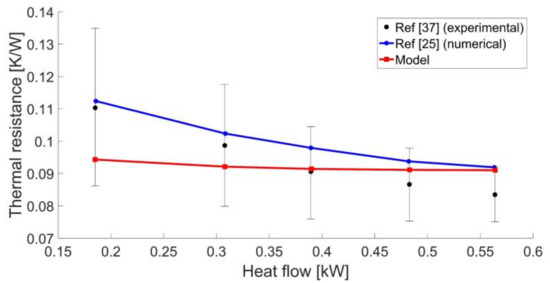The results of the current model, the experiments from [37] and the numerical model from [25] are shown in Figure 4. The uncertainties of the thermal resistances caused by measurement errors are computed for a 95% confidence interval.