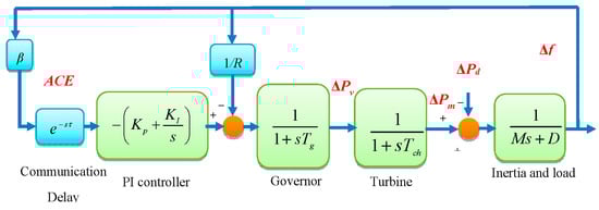 where KP is the proportional gain, KI is the integral gain, and ∫ ACE is the integration of the area control error. With the PI controller, the closed-loop system is expressed as follows: