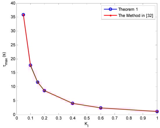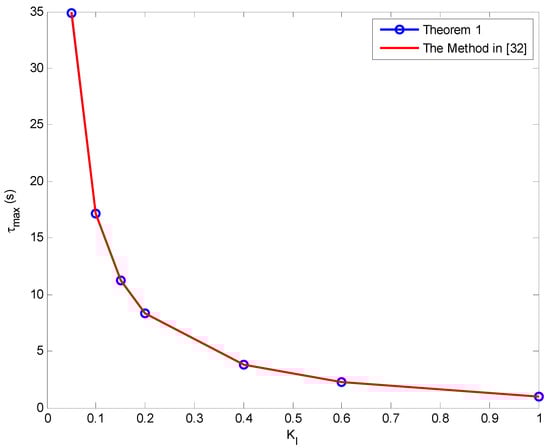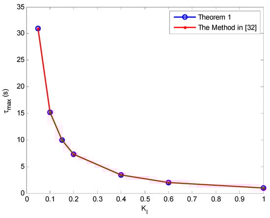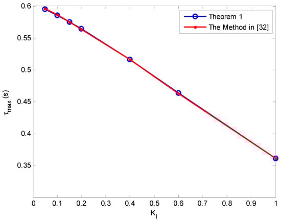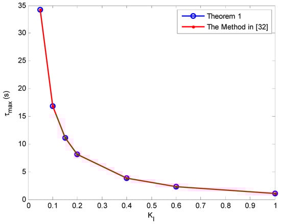 The delay margin as a function of the integral gain for various values of the proportional gain with the proposed method and the method reported in Reference [32] are shown in Figure 3, Figure 4, Figure 5, Figure 6, Figure 7, Figure 8 and Figure 9. As can be seen, the proposed method accurately determines the delay margin for the single-area LFC system. The relative error between the proposed method and the method published in Reference [32] is very small. The average relative percentage error is 0.023867% which shows that the delay margin values are nearly exactly as the same reported in Reference [32].