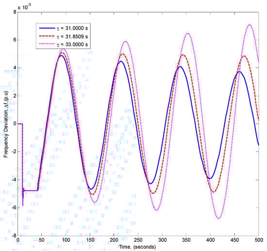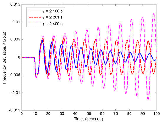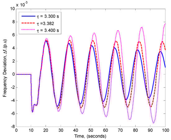 Case I (KP = 0 and KI = 0.4): In Reference [32], it is reported that the delay margin with KP = 0 and KI = 0.4 is 3.382 s, with the proposed method it was 3.382 s. The proposed method gives accurate values of the delay margin as the method reported in Reference [32]. The proposed method gives less conservative results than the LMI methods reported in Reference [16,18]. To validate the results, simulations with Matlab/Simulink were carried out. The frequency response of the LFC system with KP = 0 and KI = 0.4 for different values of the time delay is shown in Figure 10. A 0.1 p.u change in the load occurs at 10 s. Figure 10 shows the frequency response with 3.3 s, 3.382 s, and 3.4 s, and it is clear that the system is stable with 3.3 s and unstable with 3.4 s. From the simulation the system was marginally stable with 3.384 s. The percentage error with the simulation-based delay margin was 0.071%. For this system, we have only one generalized eigenvalue. The spectral radius as a function of ω is shown in Figure 11. From Figure 11 the crossing frequency was 0.4025 rad/s, solving Equation (14), we have θ = 1.3678 rad which makes the delay margin equal 3.382 s. From Figure 10 the oscillating frequency was 0.4025 rad/s which proves the validity of the results.