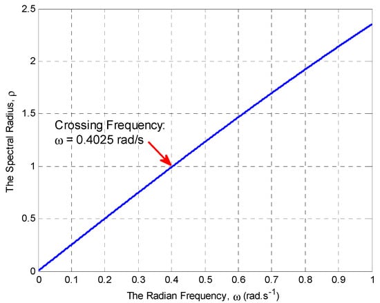 If Equation (8) is not satisfied for some values of , then the system is delay-dependent stable. Now the problem is to find the crossing frequency, , where the roots crosses the imaginary axis. To find the crossing frequencies we use the spectral radius in the following definition.