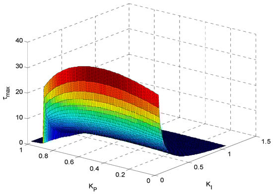 The delay margin for different values of the PI controller gains is shown in Figure 16. The delay margin dependence on KI, and KP shows similar behavior as observed in References [16,18,32]. The crossing frequencies and the crossing angles are shown in Table 2 and Table 3 respectively. The variations of the crossing angle and the crossing frequency give more details on the dependence of the delay margin on KP and KI. From Figure 16, the delay margin decreases with increasing KI if KP is kept constant. The delay margin increases as KP increase in the range KP < 0.4, then the delay margin decreases as KP becomes larger than 0.4. This is the same behavior observed in References [16,18,32]. The delay margin becomes large for small values of KP and KI.