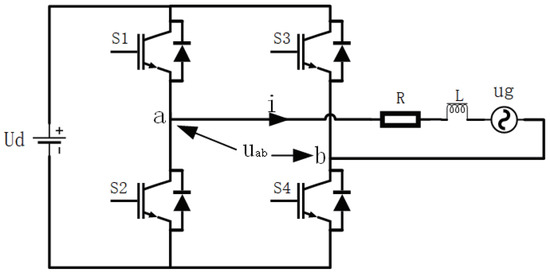 The typical single-phase inverter is presented in Figure 1, which is a well-known power electronics device employed for the conversion from DC electricity to AC. It consists of four power semiconductor switches named as S1–S4. Besides, it also contains the inductance L, resistance R and back electromotive force . represent the output current and input DC voltage.