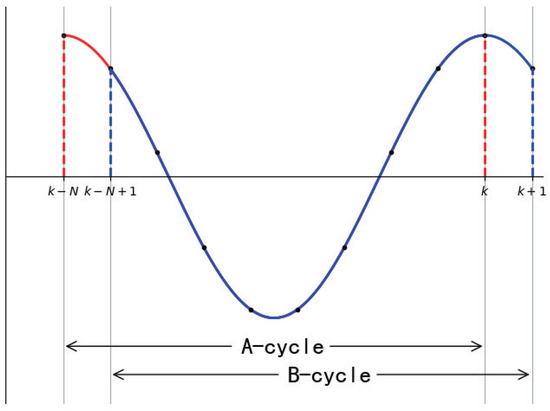 It is clear that the harmonics of current are almost the same in single or multiple fundamental period. Hence, in this paper, the THD optimization is conducted in a fundamental cycle (i.e., 0.02 s corresponding to 50 Hz) for simplicity, as illustrated in Figure 2. In this figure, A-cycle and B-cycle represent different cycles of adjacent points, and, in one cycle, the number of sampling points is described as N. In A-cycle, the DC, fundamental and THD values THD at kth point can be calculated, which are expressed as , and . Similarly, , and are calculated from the B-cycle.