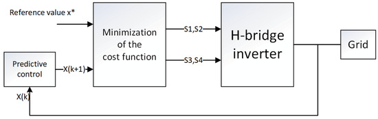 The scheme of the proposed THD-oriented FCS MPC method for grid connected inverters is presented in Figure 3. It is clear that this scheme is constructed based on the traditional FCS MPC method, where the major difference is the structure of the cost function. In this figure, the predictive control means predicting at th point under different switching combinations using the measured , mainly the output current in this paper. Note that the measured values are obtained by sensors and the prediction is based on the system model. Then, the cost function calculation is conducted with every predicted value and the reference value. After that, the switching states are selected by minimizing the cost function and the corresponding switching signals are sent to the H-bridge inverters to achieve the control goals. In the experiment, the calculations were conducted in the FPGA module. The details are presented below.