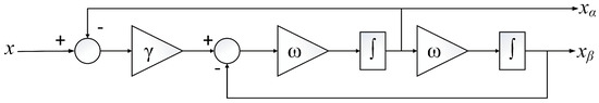 The basic structure of SOGI is illustrated in Figure 4. Except for the central frequency , the damping factor is also contained in the scheme, which can impact the influence of SOGI. The SOGI can filter the harmonics being away from . The acquisition of discrete-time integrator is important for the discrete implementation of SOGI. Using the forward Euler method for integrator estimating, the SOGI can be written as follow: