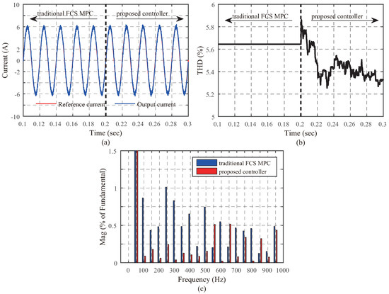 The tracking effects of two methods under same reference signal, namely, , are shown in Figure 7. In the figure, the transit time from traditional FCS MPC to proposed controller is set to 0.2 s, as presented in Figure 7a. The dynamic change process of THD is shown in Figure 7b, indicating that the THD of proposed controller is lower compared with traditional FCS MPC. In addition, the harmonic analysis in Figure 7c also presents that most of the harmonic components of proposed controller are lower than the traditional one, which is the explanation for the decrease of THD. It should be noted that the average times of switching in one second for proposed controller is 3000 while that for traditional FCS MPC is 3400, which means there are no bad effects on switching.