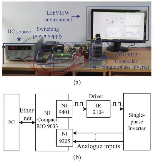 An experimental platform of single-phase inverters was implemented to further validate the proposed controller presented in Figure 8a. Figure 8b illustrates how the platform works by a block diagram and the specifications are listed in Table 2.