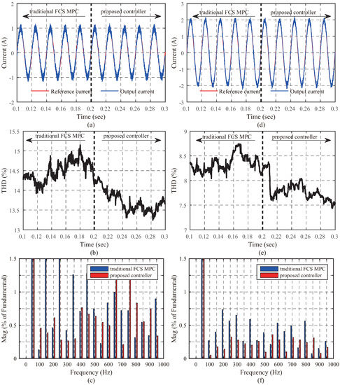 Figure 9 demonstrates the performance of traditional FCS MPC and proposed controller with and . Taking as an example, from s to s, traditional FCS MPC was used for the current tracking, while the proposed method was applied after s in Figure 9d. It can be easily found that the instantaneous THD value was reduced significantly after s in Figure 9e. Besides, through FFT analysis shown in Figure 9f of current waveform in the steady state, a lower magnitude in most harmonic components can be obtained by proposed method compared with traditional FCS MPC, which was similar to the simulation. By comparing the waveform and the THD performance, it was found that a lower THD (8.00%) was obtained from proposed controller while that from traditional FCS MPC was 8.21%, and the decline was about 2.56%. As for , there are similar results in Figure 9a–c. It should be noted that, compared with the simulations, the improvement of THD was a little lower, which may be resulted from the noise of current sensor and the time-delay from calculation.