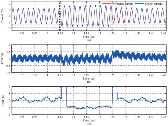 In addition, the instant response of proposed controller is displayed in Figure 10. At about 1.045 s, shown by the bold dotted line in the figure, the reference current changed from 2.5 A to 3.5 A, and the output current tracked the reference rapidly as well as the descending process. As for the tracking error, a sudden increase can be seen at the changing moment and it decreased to a reasonable range quickly. As shown in Figure 10c, THD had a large mutation when changed. Then, after a period, it dropped to normal value and gradually restores to stable status.