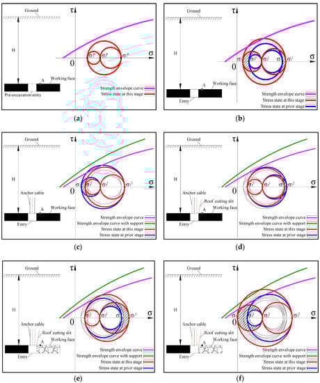 Through the field application and theoretical research corresponding to the new gob-side entry retaining technology, the stress evolution rule of the surrounding rocks in the entry retaining process can be summarized. Compared with the conventional long wall mining method, in which the section protect coal pillars must be retained, the major difference in the stress evolution of the surrounding rocks in the new method is the addition of the roof cutting stress state. According to rock mass mechanics, the stress state of any point in the rock can be simplified as three orthogonal stresses—the maximum, intermediate, and minimum principal stresses—according to the magnitude of the stress [16]. In this study, the analysis of the stress state evolution of the entry-surrounding rock is performed primarily to reflect the stress change process of the surrounding rock under the RCPRGER technology, and then to extract the stress state changes before and after roof cutting, which provides the basis for determining the key factors affecting the roof cutting process. Therefore, the analysis focuses on the main changes in the stress value of the surrounding rock, and the direction of the stress is not clearly defined. Taking point A as an example, which is located on the goaf roof closed to the roof cutting surface, its stress evolution can be summarized based on the Mohr stress circle theory, as shown in Figure 2.