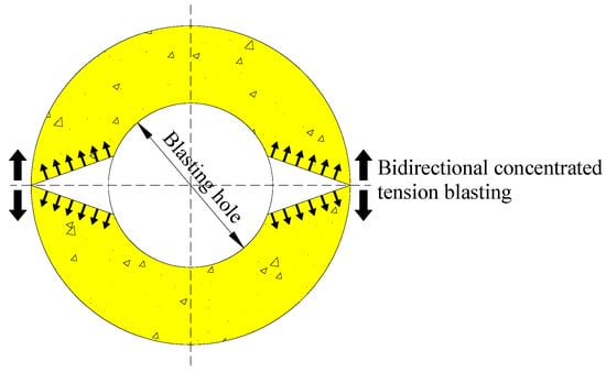 Presently, roof cutting blasting is realized by BCTB technology, that is, through the combined use of energy gathering pipes and explosives, the directional transmission of explosive energy along the leading direction of the energy gathering pipe is realized and the directional breaking of the overburden strata along the direction of roof cutting occurs [20]. In the BCTB technology, the explosive rolls should be loaded into the energy gathering pipe and then placed together into the blasting hole. The structure of the energy gathering pipe is shown in Figure 3a. There are small holes on both sides of the pipe and locked grooves on each end. Some of the pipes can be connected and installed by connecting sleeves, and the locked groove can ensure that the energy gathering pipe is inclined at a certain angle during installation. When blasting, the blasting energy is mainly released from the energy holes on both sides of the pipe (shown in Figure 3b). The presplitting principle of the surrounding rock is shown in Figure 4 [21].