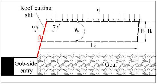 Presently, the roof cutting blasting parameters of each mine are determined via a field blasting test. First, the requirement of the roof cutting connectivity rate is determined through a mechanical analysis and calculation based on the cantilever beam theory, as shown in Figure 5 [23]: