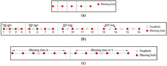 Blasthole layout of blasting test: (a) single hole blasting test; (b) interval hole blasting test; (c) continuous hole blasting test.
