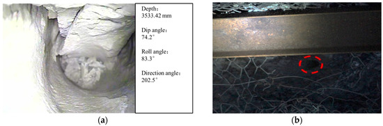 The above-mentioned test can determine the parameters of roof cutting blasting and can provide reference for presplitting blasting under similar roof conditions. However, the test process is tedious and often affects the succession of and cooperation with other related works. In addition, the effectivity of roof cutting in the test is difficult to guarantee. As shown in Figure 7, there is a high probability of occurrence of collapse in the blasting hole, breakage of roof around the hole, or a lower cutting rate. More importantly, as it is guided by the static cantilever beam theory, this test method neglects the stress evolution process of the cutting surface and the goaf roof, that is, it neglects the influence of the premining stress state on the roof cutting effect, and the consequent improvement in the requirements of blasting.