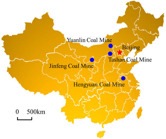 As mentioned in 3.1, the existing determination method for the blasting parameters is inadequate. However, in the early stages of application of the novel entry retaining technology, field blasting tests were inevitable and necessary, not only to realize the preliminary determination of the blasting parameters, but also to obtain the valuable primary field data to make up for the lack of engineering practice. Based on the existing test results, four typical mines are chosen in this study, and their final blasting parameters are presented as follows to provide basic reference for the research performed in this work. The four typical mines are the Tashan Coal Mine, Yuanlin Coal Mine, Jinfeng Coal Mine, and Hengyuan Coal Mine, whose locations are shown in Figure 8.
