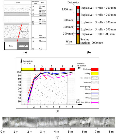 The basic parameters of the 011810 working face in the Jinfeng Coal Mine are listed in Table 3. The roof lithology and roof cutting design in the blasting test area are shown in Figure 11a. The cutting height is 9.3 m; the cutting angle is 20°; and the roof is relatively hard, including the immediate roof. Therefore, the sealing section length is determined as 2 m and the charge weight at the lower part of the hole is increased appropriately. The final charge structure of the explosive is determined as shown in Figure 11b, and the statistics of the roof cutting connectivity rate with different hole spacings are shown in Figure 11c. The hole spacing adopted in this field is 500 mm, and the average connectivity rate of roof cutting can reach 77.1% under this condition.