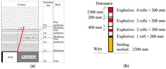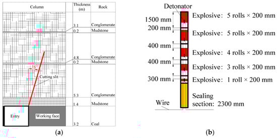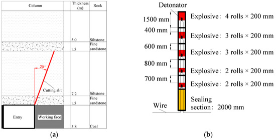 The basic parameters of the 8304 working face in the Tashan Coal Mine are listed in Table 1. The roof lithology and roof cutting design in the blasting test area are shown in Figure 9a. The cutting height is 8.3 m, the cutting angle is 15°, and the roof is a composite roof, in which the immediate roof is mudstone and is relatively broken. Therefore, the final charge structure of the explosive is determined as shown in Figure 9b, the length of the sealing section is 2 m, and the charge weight at the lower part of the hole is relatively low. In addition, the field blasting test shows that the average connectivity rate of the roof cutting reaches 82.3% when the spacing of the blasting holes is 500 mm.