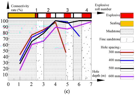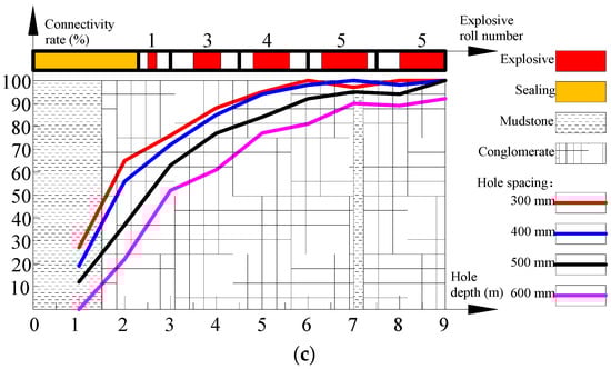 The basic parameters of the II632 working face in the Hengyuan Coal Mine are listed in Table 4. The roof lithology and roof cutting design in the blasting test area are shown in Figure 12a. The cutting height is 7 m, the cutting angle is 15°, and the roof is a soft composite roof with a large total thickness of mudstone in the roof cutting range. Therefore, the charge weight of the blasting hole is relatively small, and the sealing section length is determined as 2.3 m. The final charge structure of the explosive is determined as shown in Figure 12b, and the statistics of the roof cutting connectivity rate with different hole spacings are shown as Figure 12c. The hole spacing adopted in this field is 500 mm, and the average connectivity rate of the roof cutting can reach 81.1% under this condition.