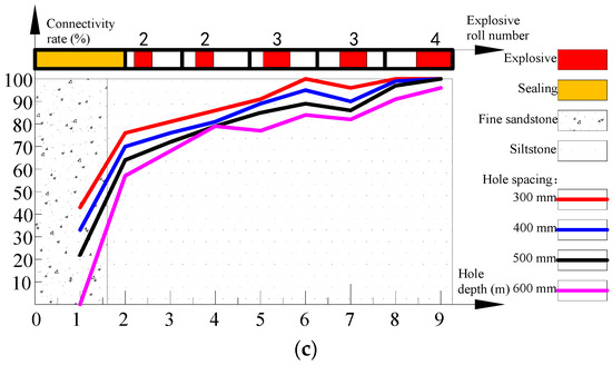 The basic parameters of the W1-106 working face in the Yuanlin Coal Mine are listed in Table 2. The roof lithology and roof cutting design in the blasting test area are shown in Figure 10a. The roof cutting height is 9 m, the cutting angle is 15°, and the roof is hard with no obvious joint development. Therefore, the charge weight of the single hole is relatively large. However, the immediate roof is a mudstone layer in this case, the sealing section length is increased to 2.3 m and the charge weight at the lower part of the hole is decreased to protect the integrity of the surrounding rock. The final charge structure of the explosive is determined as shown in Figure 10b, and the values of the roof cutting connectivity rate with different hole spacings are shown in Figure 10c. The hole spacing adopted in the field is 400 mm, and the average connectivity rate of roof cutting can reach 80.2% under this condition.
