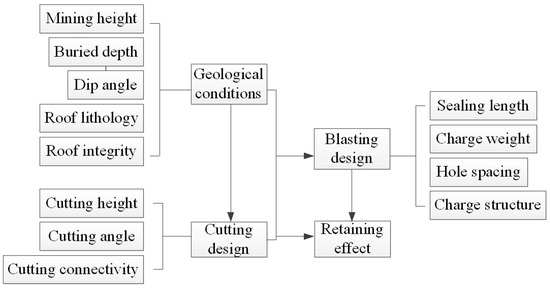 As shown in Table 5, the reference-related roof cutting blasting can be divided into four categories. The mining height, buried depth, coal seam dip angle, and roof characteristics belong to the geological data; the roof cutting height and roof cutting angle belong to the roof cutting design; the sealing length, explosive charge weight, blasting hole spacing, and charge structure belong to the blasting design; and the average roof cutting connectivity rate belongs to the roof cutting effect. Thus, according to the mechanics process mechanism and the existing roof cutting blasting design method and process, the design logic diagram of roof cutting blasting can be drawn, as shown in Figure 13. Among these parameters, the geological data directly determine the roof cutting design, and the geological data and roof cutting design together affect the blasting design. Finally, the entry retention is determined by the roof cutting design, blasting design, and construction quality. Presently, the key parameters of roof cutting design can be determined using geometric calculations, mechanical analysis, and numerical simulations based on the geological data, while the key parameters in blasting design, the research emphases in this work, are usually determined by field tests. Through the analysis presented in this section, it is noted that the blasting design is a complex fuzzy problem influenced by several factors, and it is difficult to quantitatively measure the influencing factors and the weights of each factor. However, according to the design logic diagram, we can note that the key indices affecting the blasting design are geological conditions, including the mining height; buried depth; coal seam dip angle; roof lithology and roof integrity; and roof cutting design, including roof cutting height, roof cutting angle, and roof cutting connectivity.