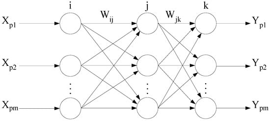 Topological structure of a three-layer back propagation (BP) neural network where Xp1, Xp2… Xpm are the inputs of the neural network; Yp1, Yp2… Ypm are the outputs of the neural network; i, j, and k are the three layers; and Wij and Wjk are the weights between the adjacent layers.