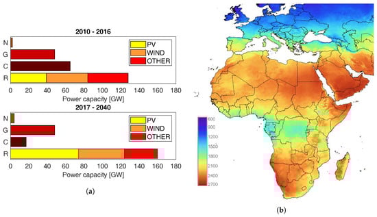 (a) Average net capacity additions per year on the global power market by type (N: nuclear, G: gas, C: coal, R: renewables) according to the World Energy Outlook 2017 [1]. (b) Total in-plane solar irradiation for an equator-facing plane inclined 20 from the horizontal (color bar units are in kWh/m). Figure adapted (that is, cropped from original) from Reference [3], used under CC BY 4.0 license.