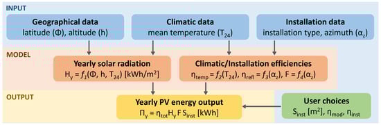 In summary, as schematically depicted in Figure 2, the proposed methodology for fast estimation of solar irradiation (Equation (1)) depends directly on geographical data (latitude, altitude) and indirectly on climatic data (average daytime temperature, which is implicitly influenced by wind, clouds, humidity, fog, pollution or other local environmental conditions). Instead, the estimation of photovoltaic energy potential (Equations (2) and (6)) relies on both climatic data (average daytime temperature, Equation (3)) and installation characteristics of the considered PV system (photovoltaic technology, Equation (2); azimuth, Equations (4) and (5); installation type—that is building-integrated or free-standing).