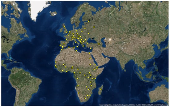 Randomly chosen geographical locations for the analysis (the full list of coordinates is reported in the Appendix A). The data set consists of 80 locations, 40 in Europe and 40 in Africa. Map source: ESRI World Imagery [30].