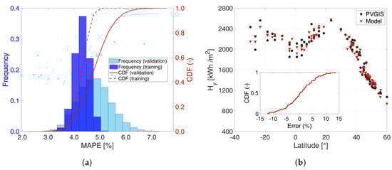 The full set of data for these 80 random locations is split in two different subsets, namely a training and a validation set. The model coefficients of Equation (1) are initially fitted on the training data set; then, the best-fitted model is used to predict the responses for the observations in the second data set (the validation one), which provides an unbiased evaluation of the model fitting. Here, the training data set is taken as 70% (i.e., 56 locations) of the whole data set; whereas, the validation one includes 24 locations. The training/validation process is iteratively repeated 10,000 times, with a random distribution of locations in the two subsets, and standard error metrics are computed with respect to the values provided by the PVGIS tool [42]. The distribution of the mean absolute percent error (MAPE) for the 10,000 repetitions is reported in Figure 4a, for both the training and the validation steps. The MAPE distribution shows a Gaussian shape, with average values equal to 4.3% (training) and 4.9% (validation).