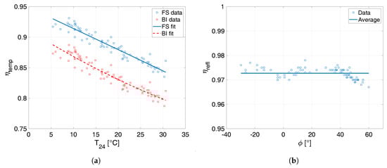 (a) Temperature and low-irradiance efficiency () as a function of the average daily ambient temperature () for the given locations: best-fitted models of Equation (3) (lines) are compared with the values taken from the PVGIS tool (dots) for the 80 locations in Europe and Africa shown in Figure 3. Crystalline silicon solar cells are considered. Free-standing (FS) installations are depicted in blue; whereas, building-integrated (BI) installations in red. (b) Reflectance efficiency () as a function of the latitude for the 80 locations in Europe and Africa: the values taken from the PVGIS tool (dots) and their average value (line) are shown.