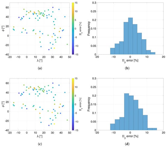 The values are finally computed by Equation (6), considering an indicative efficiency for the crystalline silicon solar cells equal to [50], a system installation efficiency equal to , and a unitary surface exposed to the sun. The predicted values for the 80 locations in Europe and Africa are compared to those provided by PVGIS tool, and the relative percent error is reported in Figure 6a,b (free-standing installations), and in Figure 6c,d (BI installations), respectively. Results show that the maximum relative error for FS installations is 14.8% in absolute value, MAPE is 4.3% and NRMSE is 5.5%. Similar errors are obtained for BI solutions, namely a maximum relative error equal to 15.4% in absolute value, MAPE equal to 4.3% and NRMSE to 5.5%. These values are essentially coherent with the prediction errors of discussed in the previous Section, which therefore represent the main source of uncertainty in the estimation. These uncertainties are consistent with the general accuracy provided by other tools for estimating the PV potential throughout large territories. For example, PVWatts tool shows errors as high as for annual PV electricity production, with actual performance in a specific year up to respect to long-term average [13]. These uncertainties are also similar to those indicated by JRC (i.e., from to ) when the effect of irradiation and temperature on PV module performance are both considered [3].