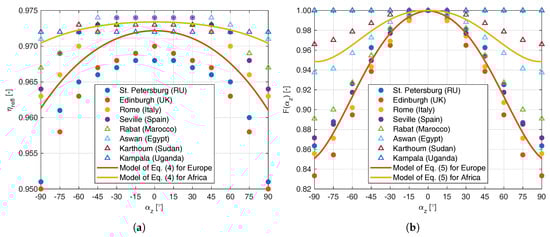 The results are shown in Figure 7a,b, where we also compare the solution given by Equations (4) and (5), respectively. The parametrization of these two latter equations was previously obtained for Italy, using the raw data of seven cities throughout the peninsula for the reflectance efficiency and the only data of Rome for the scaling factor [24]. We note that the parametrization for Italy gives well-representative curves also for the other locations in Europe: the maximum relative error is 2.1% on the reflectance efficiency and 13.8% on the scaling factor at the maximum azimuthal angles considered (). We can then assert that, given the geographical location of Italy at intermediate continental latitudes, this parametrization can be assumed to be representative also for Europe—and the coefficients are reported in Table 3. On the other hand, the results for Africa require a specific treatment, as the decrease in latitude towards the equator significantly modifies both the reflectance efficiency and the scaling factor with respect to those of the European spots. We then proceed with a new parametrization of the models by regression, using the data of the four considered locations in Africa. We obtain the coefficients reported in Table 3. In this case, the maximum relative error is 0.3% on the reflectance efficiency and 6.4% on the scaling factor at the maximum azimuthal angles. Considering that is the most unfavorable and limiting situation for an installation, the proposed models provide acceptable approximations for the reflectance efficiency and scaling factor. In particular, according to the results obtained, the parametrization for Europe can be adopted in the range of latitudes , while that for Africa from to the equator (). Symmetry applies for locations in Africa below the equator (negative latitudes).