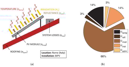 (a) Sample analysis of the various contributions to the total losses () for a building-integrated installation (BIPV) in the city of Rome (Italy) with unitary exposed surface. The azimuthal angle considered is ( losses), the module efficiency is ( losses) for crystalline silicon solar cells [50], and the installation efficiency is ( losses). (b) The results obtained show that the main contribution to the total losses depends on the choice of the module technology.