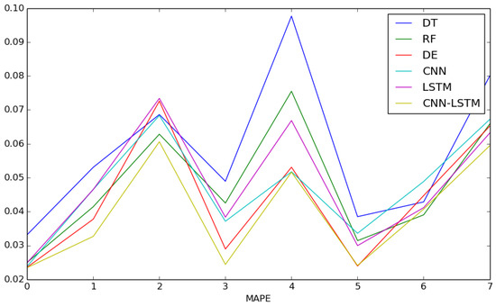 In this application, random forest (RF), decision tree (DT), DeepEnergy (DE) [28] and the proposed CNN-LSTM model were implemented and tested in the prediction of the next 24 h load forecast. Besides, the CNN module and the LSTM module were also extracted and tested to demonstrate the superiority of our proposed model. The result obtained by the proposed CNN-LSTM model is illustrated in Figure 6. To evaluate the performance and stability of the proposed model, the test dataset was divided into eight partitions. The detailed experimental results of each model are illustrated in Table 1, Table 2 and Table 3.