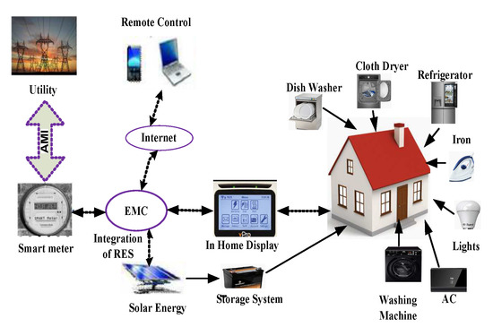 An SG introduces a new vision of energy and information flow to create automated energy control and management network with DSM programs [63,64]. The current research in SG majorly focuses on the DSM, DR, and scheduling techniques to enhance the energy efficiency, stability, and power system capacity [65,66]. In this research, we focus on price based DSM programs where the most commonly used pricing schemes include: TOU, CPP, IBR and RTP. The hourly change in RTP may additionally replicate the utilities value of generation or the bargain price level. Subsequently, RTP has a substantially better versatility than TOU and CPP [67]. The focus of DSM program is not to overcome electricity demand during on-peak hours; however, even the EP in low-peak hours which may also prevent rebound peaks. Therefore, RTP may reduce electricity cost; however, it may create peaks that bring high PAR in off-top availabilities. Therefore, an amalgamation of RTP with IBR would be used. When energy demand exceeds from certain level or predefined threshold, then electrical price (EP) would be adjusted which is in accordance with minimum and maximum limits. The IBR with RTP model would proficiently reduce the PAR and hence improve the entire system stability. First, we adopt a model by taking into consideration four types of household appliances and an effective and simple mode to model them based on LOT, electricity prices during off-peak time slots, user comfort, and cost savings according to their electricity usage (Figure 1). Second, we will use GA that will be utilized as a bench mark function in order to evaluate the performance of energy consumed in homes. Third, an amalgamation of RTP with IBR will be used for electricity cost and PAR reductions. Fourth, integration of RESs which protects the environment from carbon dioxide (CO 2 ) emission and reduces the electricity cost.