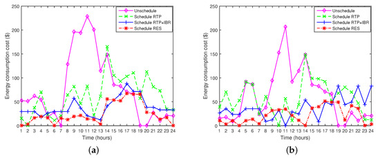 Figure 9. Unscheduled and scheduled cost profiles against various cases; RTP, RTP+IBR and RES. (a) without control parameter; (b) with control parameter.