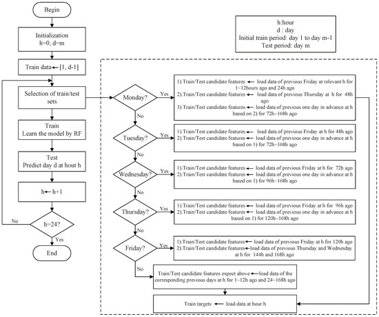 For the load prediction, historical data as a training sample is used to learn a reliable model by a random forest algorithm and validate the predictive capability of the model with a test data-set that the model has never seen before. Four test days, 28 April, 7 June, 17 October and 31 December, are selected for the testing of PJM representing the four seasons of year. Likewise, 15 June and 10 August are the test sets for the RSF building. The initial training set are all from 17 January to the day before beginning of the testing. Concerning the RF parameter configuration, the number of trees is equal to 500, while the number of features to split at each node is based on Equation (10).