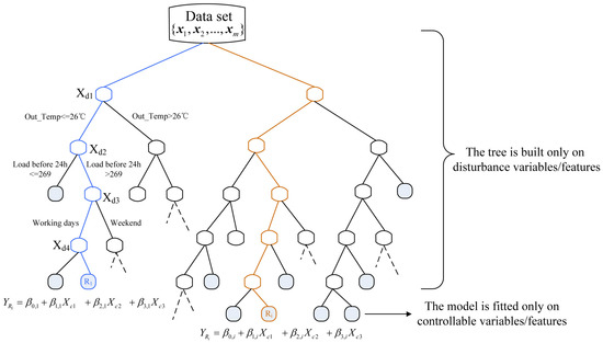 Figure 3 shows the concept of an MBCRF tree. For learning the demand response model of the building, candidate features can be further separated into disturbance variables such as outside temperature, humidity, etc. and controllable variables like the temperature and lighting set points within the building. As described in Section 2.2, the controllable variables are to be solved during the DR event and therefore the corresponding value is unknown. During the establishment of the model tree, if the controllable variables are used to partition the feature space in training process, this will fail to get the final region for a forecast of the input feature vector. Therefore, only the disturbance variables are used as the splitting feature sets during the generation of a tree. MBCRF randomly selects splitting feature for an internal node and chooses the one as the best partition feature according to SDR. Then, the process of recursive partitioning is implemented similar to CART in RF. When an MBCRF tree is built, a linear regression model in each leaf node will be only fitted over the control variables :